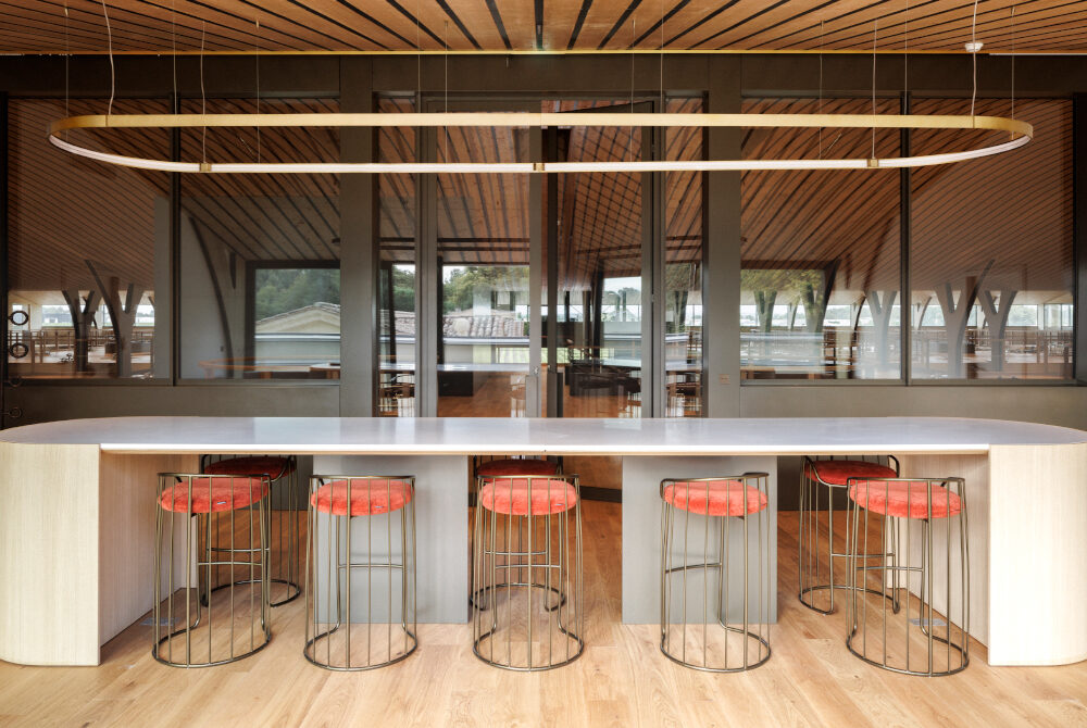 Im Zentrum des Verkostungsbereichs nimmt eine maßgeschneiderte Arena-Hängeleuchte den Ehrenplatz ein. Die Leuchte wurde in enger Zusammenarbeit mit dem Architekten entworfen und maßgeschneidert, um den Umfang des Verkostungstisches widerzuspiegeln und eine perfekte visuelle Harmonie zu schaffen.