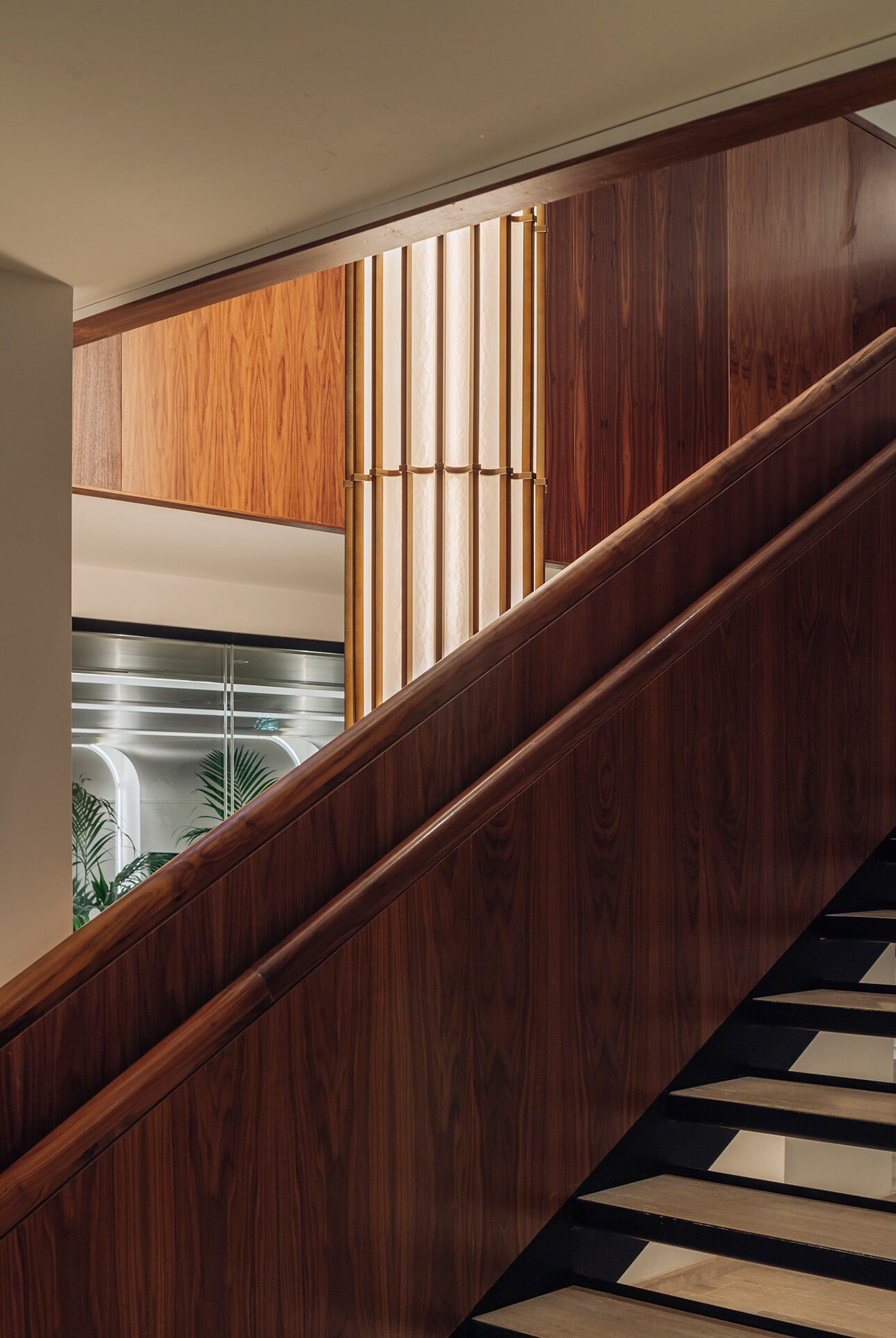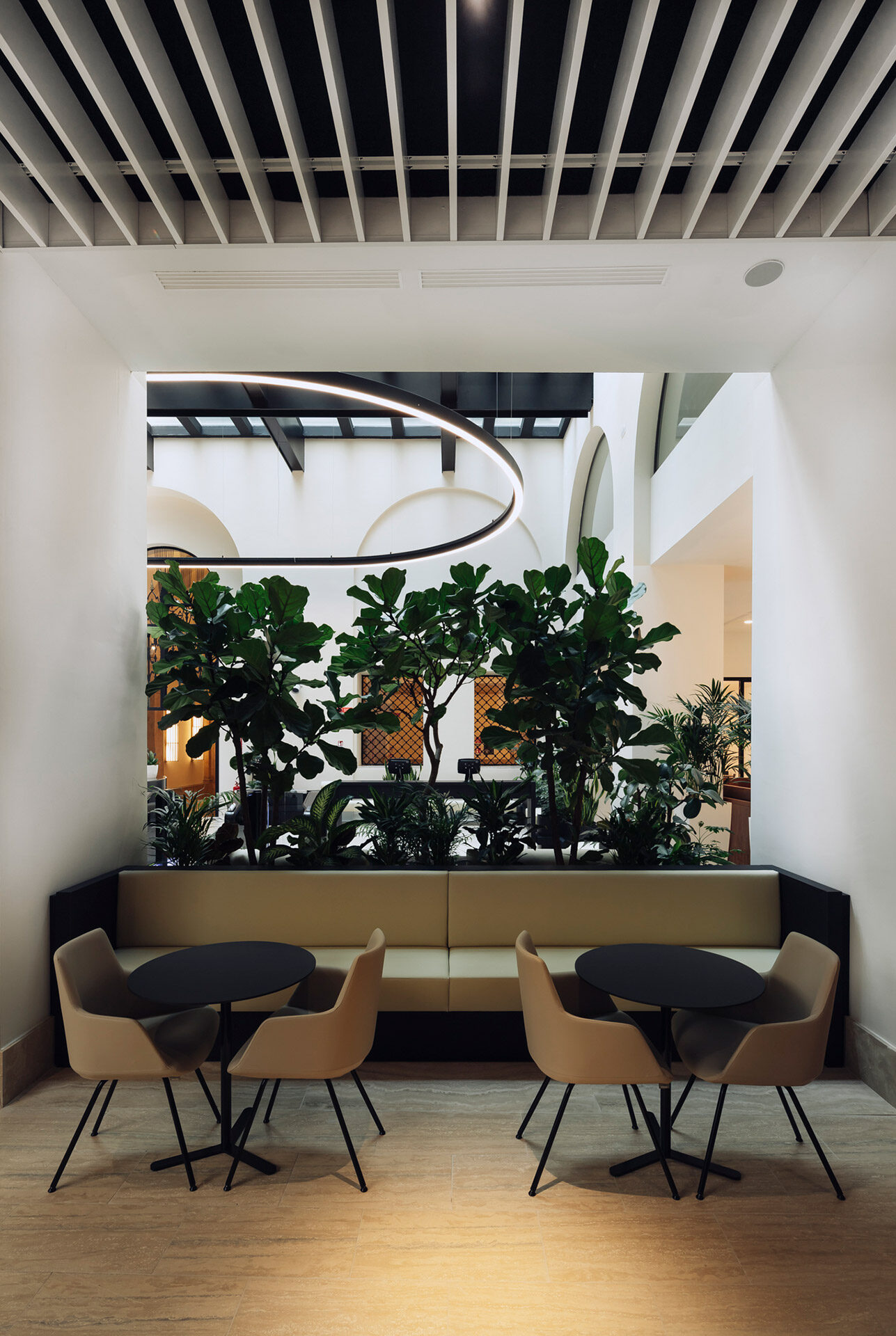 Ein Schlüsselelement dieser Umgestaltung ist der strategische Einsatz von Licht. Die Neugestaltung der Räume mit der Neupositionierung der Kernbereiche und Fensterfronten zum Innenhof hin hat die visuelle und physische Durchlässigkeit des Gebäudes verbessert. Ein transparentes, begehbares Oberlicht über der Hauptlobby lässt nicht nur reichlich Tageslicht herein, sondern schafft auch eine direkte Verbindung zwischen den Räumen im Obergeschoss, wodurch das Licht zu einem Protagonisten eines einzigartigen Raumerlebnisses wird. Das Licht wird so zu einem roten Faden, der die Räume verbindet, die architektonischen Proportionen hervorhebt und ein Gefühl der Offenheit und Kontinuität zwischen den historischen und modernen Räumen vermittelt.